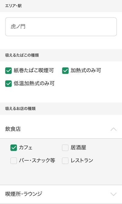 さらにCLUB JTの喫煙所マップは、左上の「喫煙スポット・購入場所」の検索窓をタップすることで、喫煙所を利用したいシーンにあわせて検索条件を絞り込むこともできます。